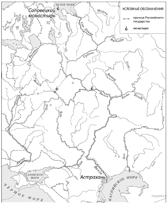Подпишите на карте город Астрахань и Соловецкий монастырь.
